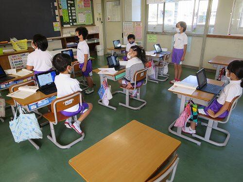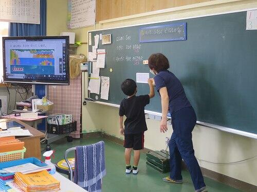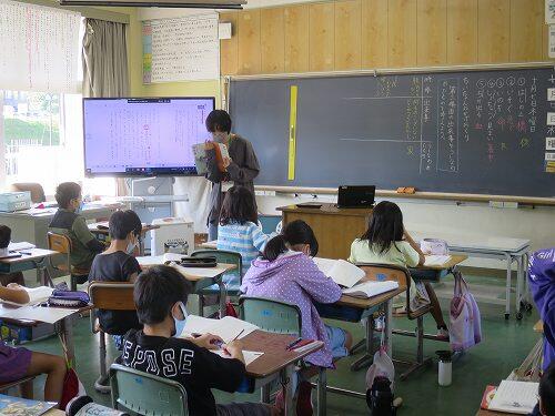 5年生は、算数の「平均」の学習をしていました。先生が児童のノートをタブレットで撮影し、その画像をテレビに送って発表させていました。先生のICT操作能力も少しずつですが、レベルアップしてきています。
