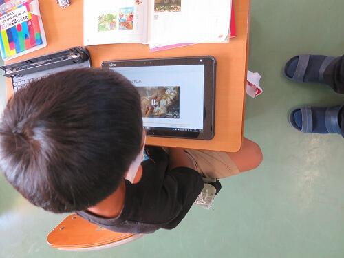 5年生は総合的な学習の時間で、稲刈りの様子をタブレットにまとめる活動をしていました。