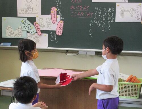 次は、「忘れた帽子を友だちに届ける場面」での互いの言葉かけについて練習しました。「やさしく・笑顔で・相手を見て・心を込めて」のポイントを意識して練習しました。
