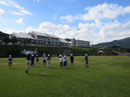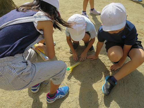 3年生が理科で、日なたと日かげの地面の温度をはかる実験をしていると、どこからかヘリコプターの音が近づいてきます。ヘリが見えると、「あっ、あおぞらだ!」子どもたちがヘリコプターの名前を知っていることにびっくりしました。