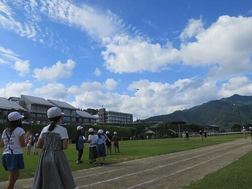 「おーい!」遠くから子どもたちの声がします。天神山の方を見ると、1年生の子どもたちでした。1年生へのお返しで、こちらからも返事をしました。