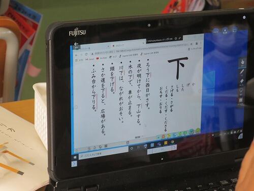 3校時、6年生は国語の時間にタブレットを使っていました。天板拡張くんを児童用机に装着したおかげで、タブレットの操作がスムーズにできるようになりました。