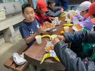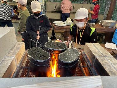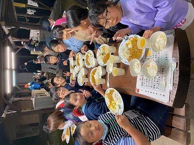 みんなでカレーを作って食べました。飯ごうで炊いたご飯は、普段食べるご飯とは違っておこげもあり、とてもおいしいです。大盛りのカレーをペロリと食べていました。