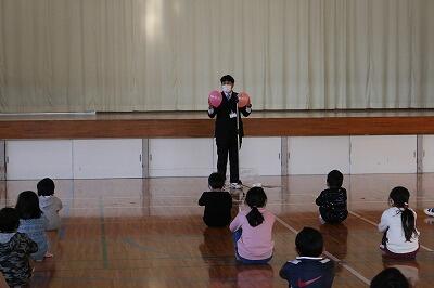 校長先生からは、友達への言葉遣い、心遣いをすることの大切さについてのお話でした。「元気のないひとがいたら?」「ひとりぼっちでいる友達がいたら?」と問いかけに、子ども達は「声をかける。」「一緒に遊ぼうと言う。」などと、友達を思いやる発言をしていました。