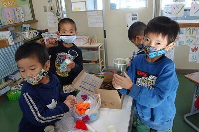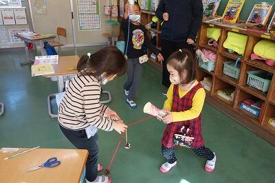 はじめに、けん玉を作って遊びました。松ぼっくりがコップに入ったら成功です。