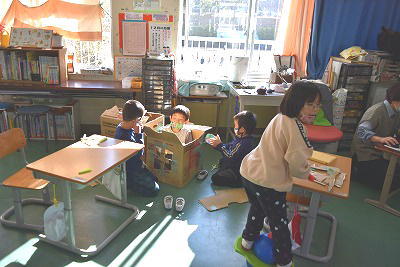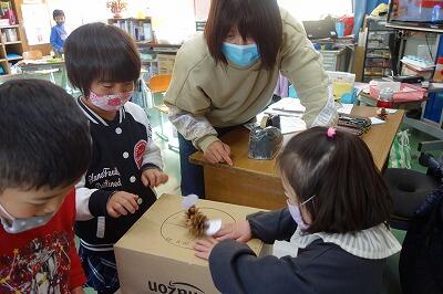 1年生が、生活科の時間に松ぼっくりを使って、楽しく遊んでいました。