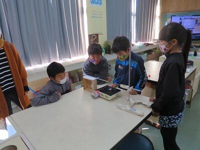 3年生は、電気を通すものを実験で調べていました。鉛筆やふでばこ、1円玉など、様々なものが電気を通すか確かめていました。