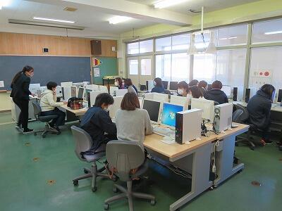 6年生の保護者はパソコン室で卒業アルバムの写真選びをしていました。