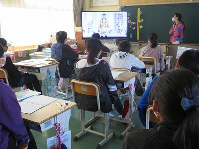 1年生は外国語のお勉強でした。クリスマスに関わる言葉を楽しく勉強しました。ALTが「アメリカではクリスマスにチキンは食べません。」と言うと、みんなびっくりしていました。