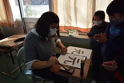 3年生が習字をしていました。3年生から毛筆をするのですが、みんなずいぶんと上手になりました。
