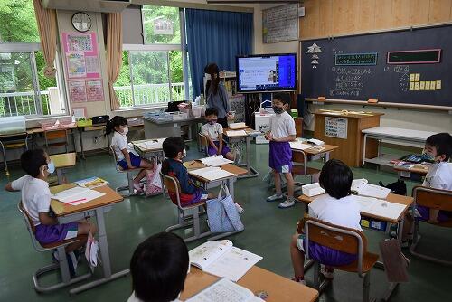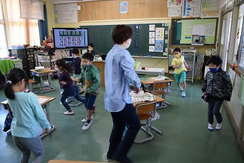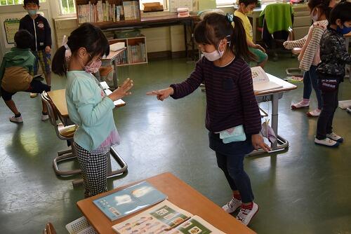 1年生が国語の時間に「好きな動物について友達に話そう」という学習をしていました。教室を歩いて先生の合図のときに近くにいる友達とペアになります。そして、ジャンケンをで勝った方からお話をします。