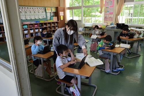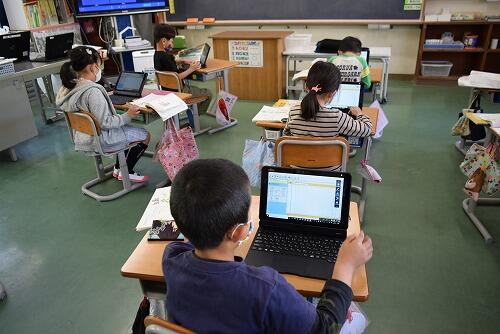 国語の時間に2年生がタブレットを使って作文に取り組んでいました。