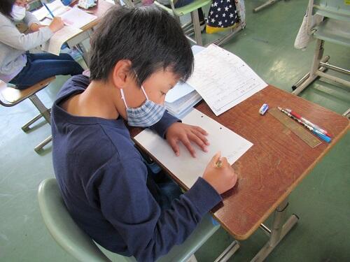 4年生です。先生の板書を一生懸命ノートにとっている様子が分かります。