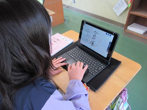 5年生はタブレットを使って、ペア同士で漢字の問題を出したり、解いたりしていました。