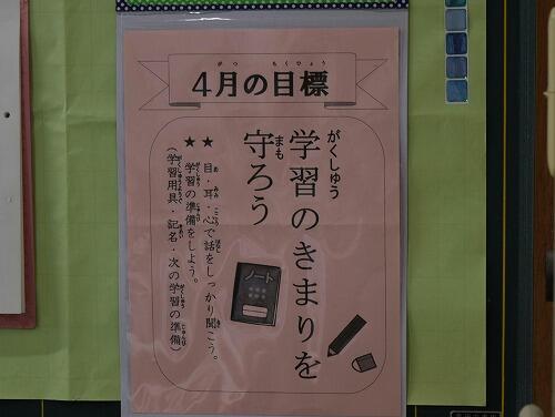 もうすぐ4月が終わりますが、子ども達は4月の目標を意識して学習に取り組みました。先生や友達の話を聞いたり、ノートに書いたり、学習にしっかり向かう姿が見られます。