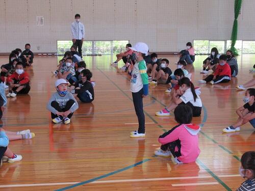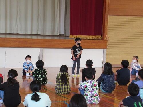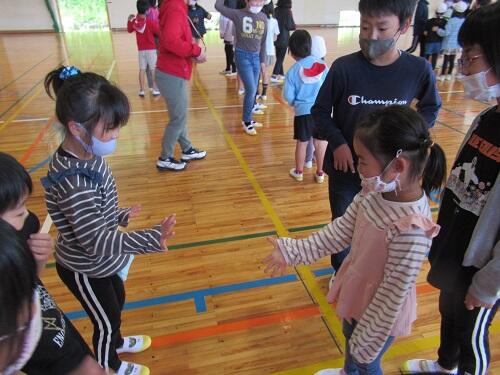 次に、学校の施設についての〇✕クイズをしました。その後、じゃんけん汽車ぽっぽをしました。先生たちも加わって、盛り上がりました。