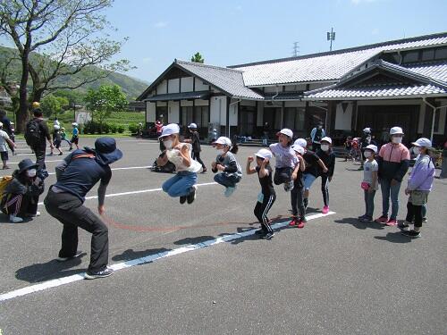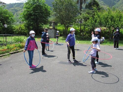 現地に着いたら、めいめいフラフープをしたり、長縄をしたりして遊びました。