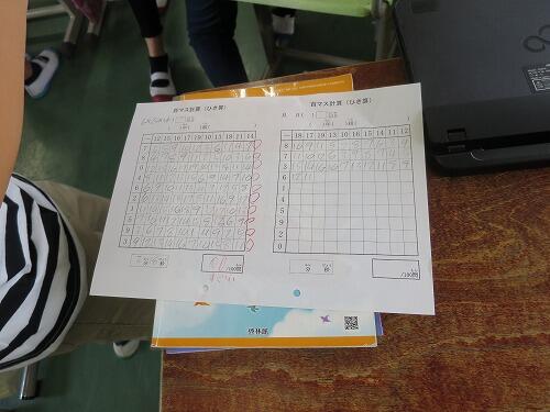 4年生では、計算力をつけるために百マス計算に取り組んでいます。