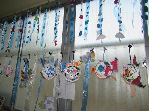 階段踊り場の掲示物は、梅雨の時期ならではものになっています。1年生が、図工の時間を使ってオリジナルのかたつむりを制作しました。とってもすてきですね。