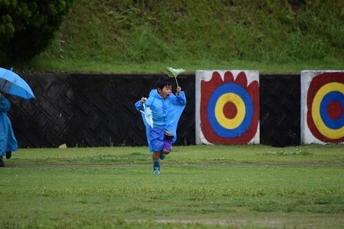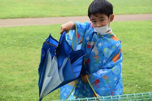1年生が生活科の学習で、雨のなかで散歩をしていました。