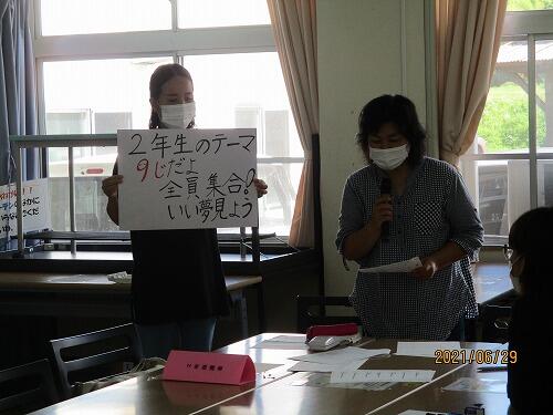 最後に各学年の今後の取組について発表しました。2年生は夜9時以降まで起きている理由が「みんながおきているから」だったため、家族みんなで早寝に取り組もうということになりました。