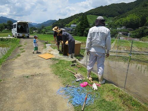 PTA環境整備部の皆さんを中心に、アイガモを放す田んぼの網はりと小屋作りをしました。あさっては放鳥の日です。楽しみですね。