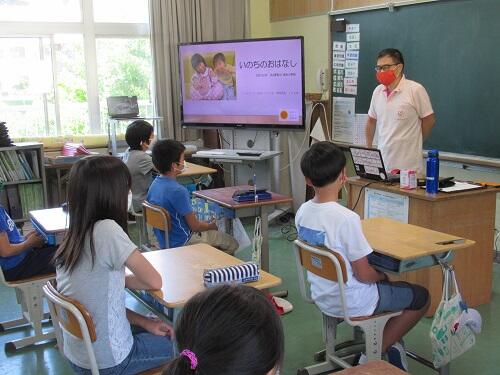 7月第1週の「宮崎県いのちの教育週間」に合わせて、全学年、「いのちの教育」をテーマにした授業を行いました。低学年は、か母ちゃっ子クラブの助産師の吉田さんより授業していただきました。