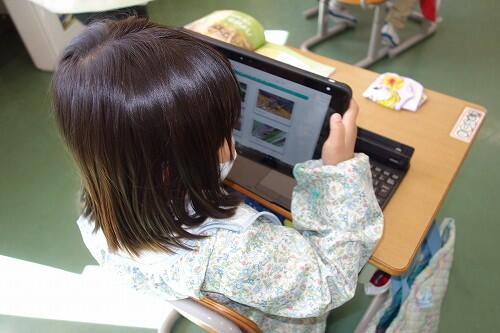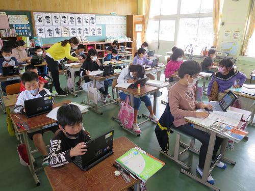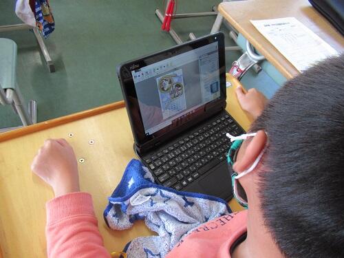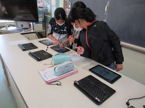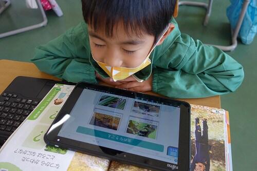 5年生は総合的な学習の時間で、稲刈りの様子をタブレットにまとめる活動をしていました。