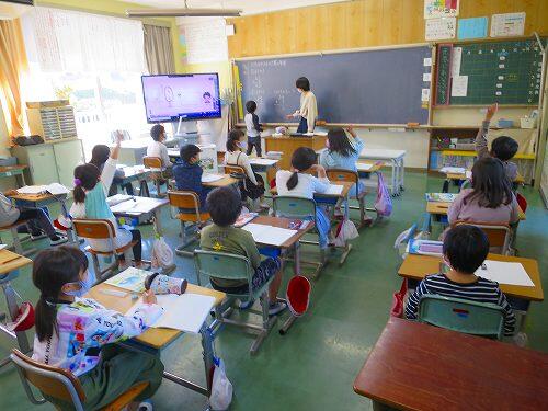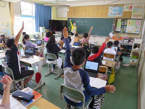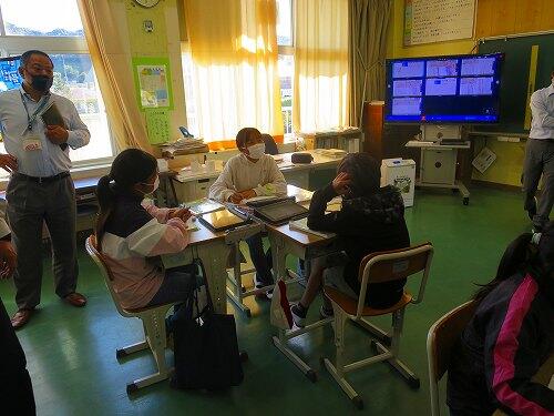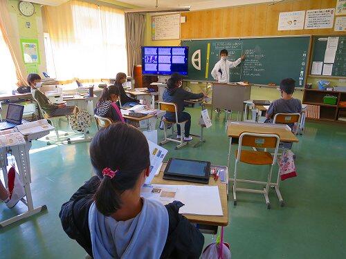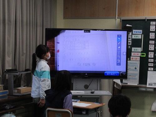 5年生は、算数の「平均」の学習をしていました。先生が児童のノートをタブレットで撮影し、その画像をテレビに送って発表させていました。先生のICT操作能力も少しずつですが、レベルアップしてきています。