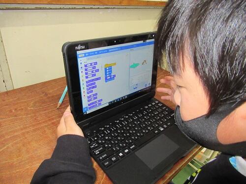4年生はテストが終わった後のすきま時間を利用して、ジャストスマイルドリル、キーボード操作、プログラミングなどタブレットを使った学習に取り組んでいました。スクラッチをしていた児童は、キャラクターの動きを思い通りにするために、プログラムを何度もやり直していました。プログラミングでは、プログラミング的思考の育成をねらっています。