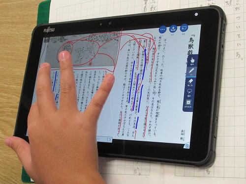 6年生は、国語の授業で説明文「鳥獣戯画」の読み取りをしていました。文章のどの部分が絵のどこの説明にあたるのか、タブレット上で線で結び付けていました。児童は慣れた手つきで、ペンの色や太さを変えたりして自分の考えを表現していました。