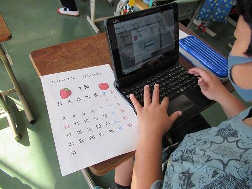 タブレットクラブでは、来年のカレンダーづくりを行いました。イラストや写真を貼り付けて、オリジナルのカレンダーをつくりました。
