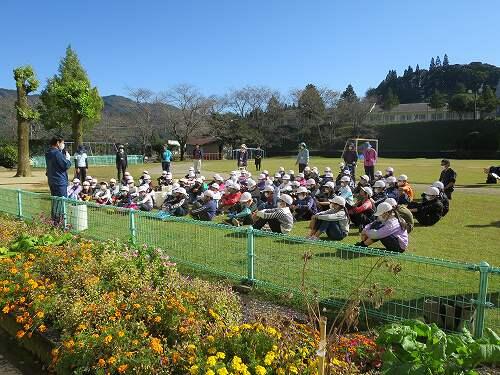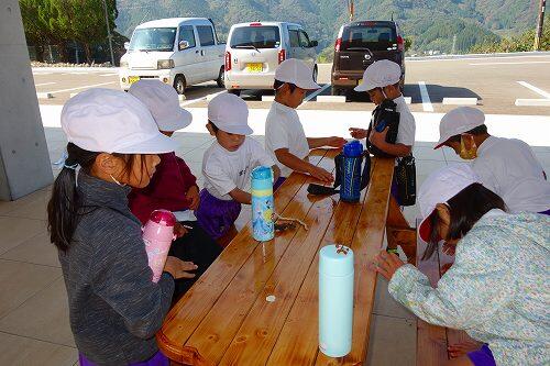 「おーい!」遠くから子どもたちの声がします。天神山の方を見ると、1年生の子どもたちでした。1年生へのお返しで、こちらからも返事をしました。