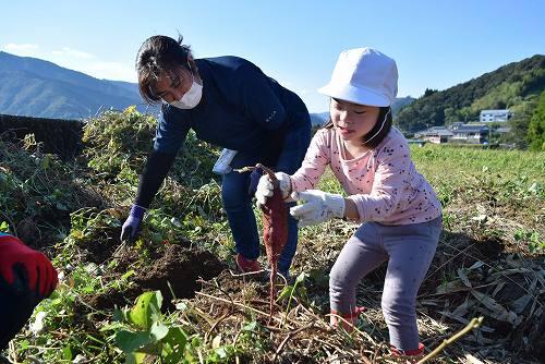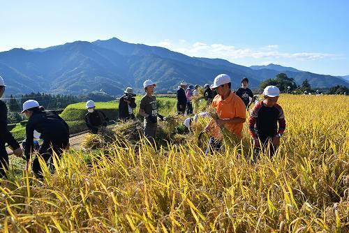 10月26日は2回目の生産活動があり、芋掘りと稲刈りを全校児童と保護者や協力者の皆さんと行いました。