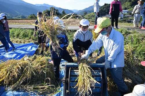 コンバインでも脱穀しました。機械のなかを見ると、脱穀機がそのまま入っていて、脱穀の仕組みが変わっていないことにびっくりしていました。