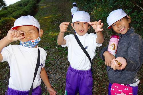 歩きながら、たくさんの秋を見つけました。拾ったどんぐりを見せ合っています。