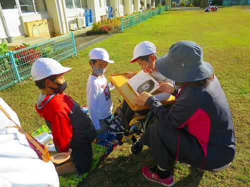 今日の朝の活動は「なかよし読み聞かせ」でした。上級生が下級生に読み聞かせをする会です。しき物を持ってきて、グループ毎に運動場で行いました。上級生が下級生のために選んだ本を読み聞かせると、下級生はじっと話を聞いていて、終わると拍手をしていました。