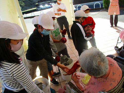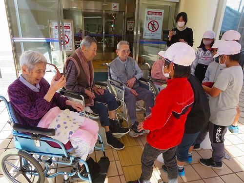3年生は、生産活動で収穫したさつまいもを1~3年生を代表して届けました。6年生は学級で製作した「プラスチックラベルアート」を届けました。少しの時間でしたが、交流もできて、子どもたち、そして、おじいちゃん、おばあちゃんもとてもうれしそうでした。