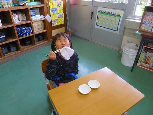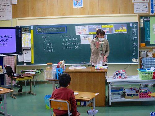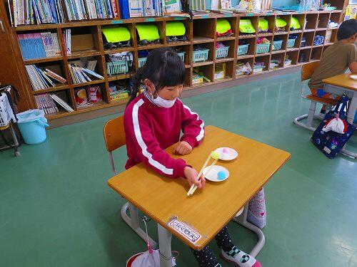 1年生では、おはしの正しい持ち方について、栄養教諭の先生と勉強していました。