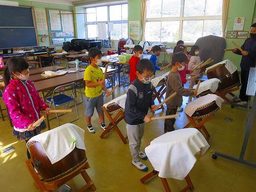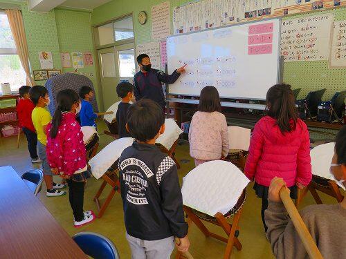 「ドン ドン ドン ウン」「ドン ドド ドン ウン」など様々なリズムで太鼓をたたいていました。みんなで太鼓をたたくと、音がおなかに響いてきて、とても気持ちよくなります。子どもたちもとても気持ちよさそうでした。