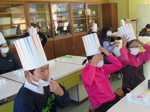 改めて、日本の椎茸のすばらしさを感じることができました。最後に、フランスから届いたというコック帽をかぶって、みんなで記念撮影をしました。楽しい楽しい授業でした。