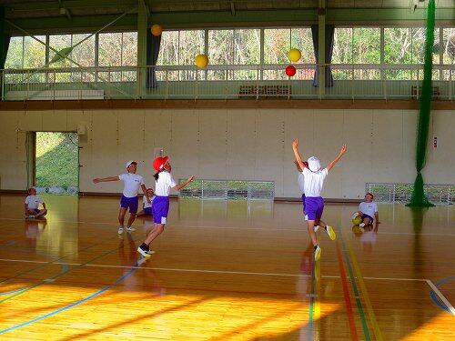 4年生が体育の時間にキャッチバレーをしていました。ネットをはさんで、チームでボールを3回まわして、相手に返します。バレーボールと似ていますが、ボールを下から投げる点とキャッチするという点が違います。