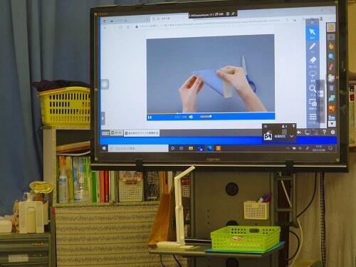 長方形の向かい合う辺の長さが等しいことを勉強した後、長方形から正方形を切り取る方法を勉強しました。デジタル教科書をクリックすると、その方法が動画で流れて子どもたちと確認することが出来ました。