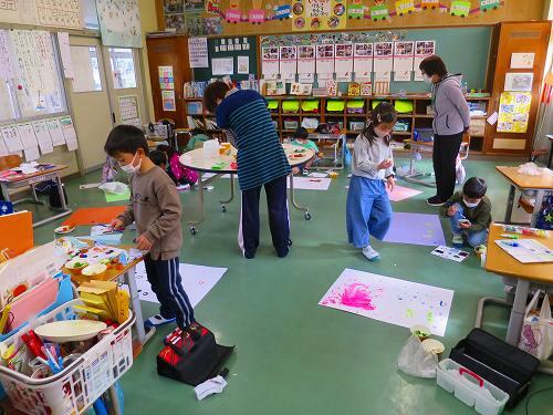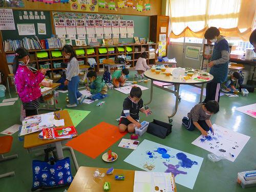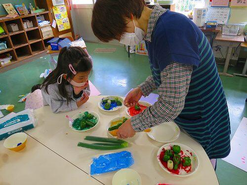 切った野菜に絵の具をぬって、画用紙にペッタンとはりつけると、野菜の形がきれいにつきました。ニンジンやタマネギ、ピーマン、レンコンなど、いろいろな野菜でやっていました。
