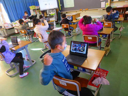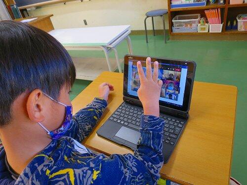 背景を変えたり、ミュートを外して話をしたり、操作を確認していました。いつも見ている先生や友達ですが、画面にうつるとみんな笑顔になりますね。