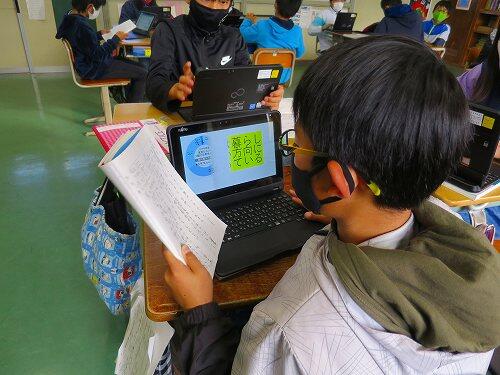 今日の2・3校時、総合で米づくりでお世話になった方々(甲斐政盛さん・小川鉄平さん)を招待して、感謝の気持ちを伝える会を行いました。まず、お二人に感謝のメッセージをプレゼントしました。