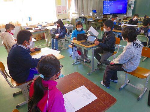 4校時、5年生は「ビブリオバトル(書評合戦)」を行いました。図書活動推進員の戸髙真紀先生にも加わっていただき7名の2グループで競いました。
