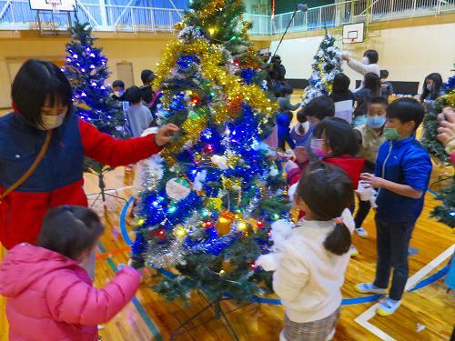 1~4年生はクリスマスツリーの飾り付けをしました。