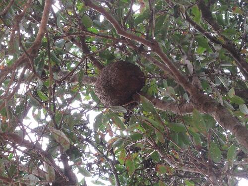 昼休みに、子どもたちが「ハチの巣」がありますと教えてくれました。見たら、見事なハチの巣です。子どもたちが刺されてはいけないと思い、教育委員会に知らせることとしましたが、おかしなことにハチが全く飛んでいませんでした。もしやと思い、棒でつついたらとても硬く、どうやら木のこぶでした。大笑いしました。