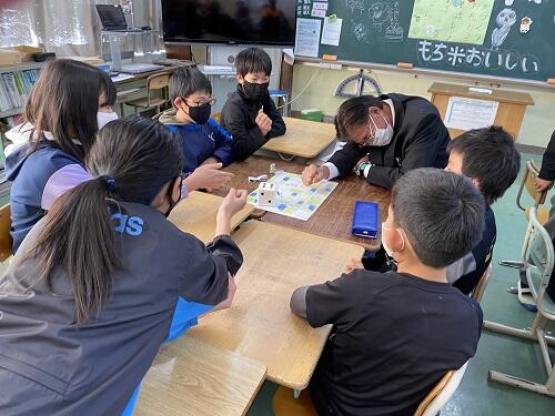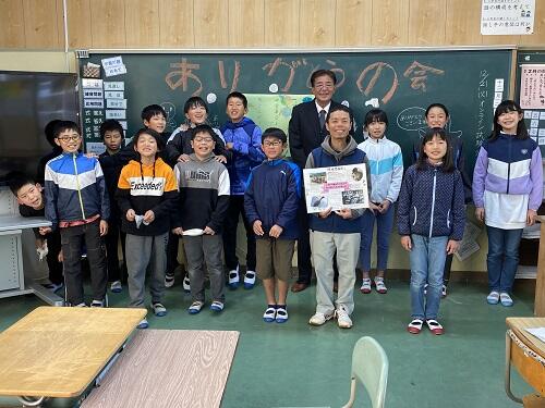 今日の2・3校時、総合で米づくりでお世話になった方々(甲斐政盛さん・小川鉄平さん)を招待して、感謝の気持ちを伝える会を行いました。まず、お二人に感謝のメッセージをプレゼントしました。